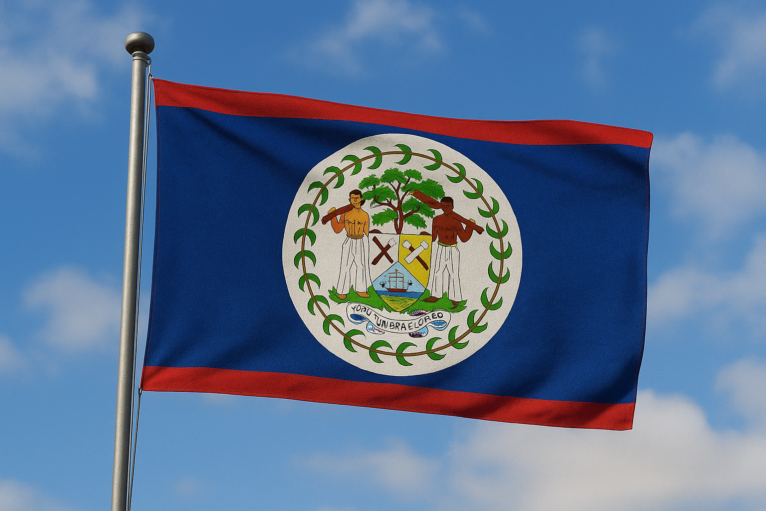 Tu je ilustračné zobrazenie vlajky Belize, verne zachytávajúca jej tmavomodré pole s červenými pruhmi a detailným erbom v strede.