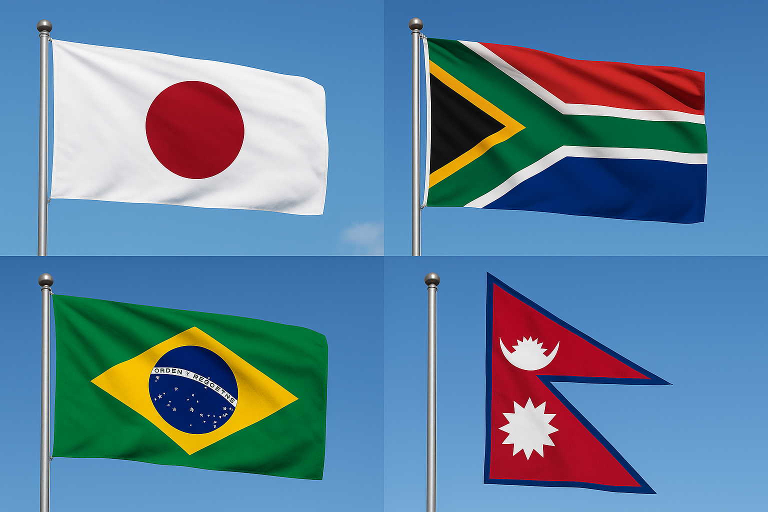 Na obrázku je kompozícia štyroch vlajok vedľa seba: japonská, juhoafrická, brazílska a nepálska.